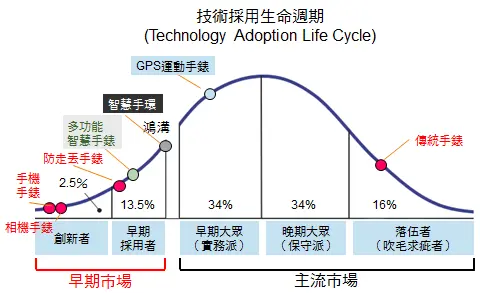 技术采用生命周期为一钟形曲线(Bell Curve),该曲线将消费者采用新技术的过程分成五个阶段,分别包括创新者、早期采用者、早期大众、晚期大众与落后者。上述五个阶段的占整体使用人数比例分别为2.5%、13.5%、34%、34%与16% 。根据Roger的研究,上述五个不同阶段的使用者具不同特色,包括: