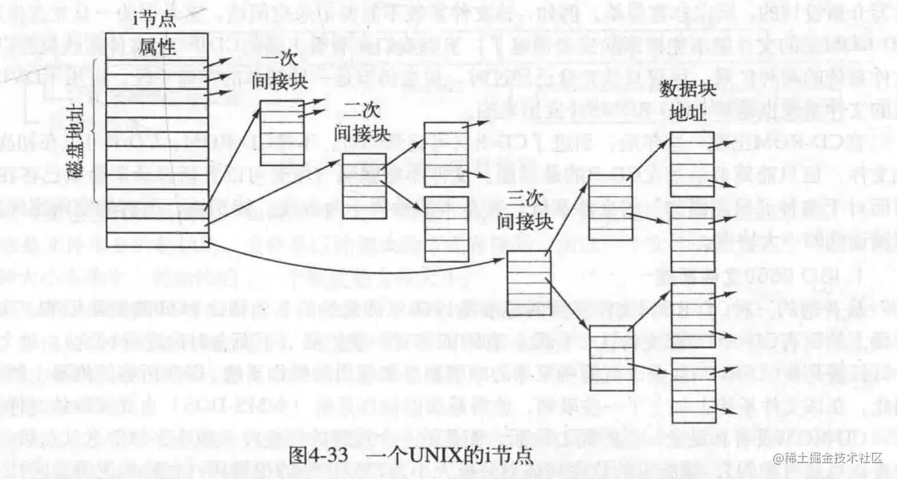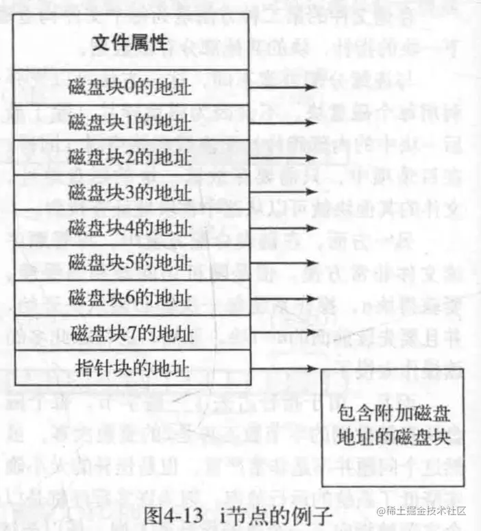 i节点是给每个文件一个i节点,里面记录了文件的属性,以及每个磁盘块的地址,如果节点不够记录文件了,那么让其中几个记录磁盘地址的项记录另一个包含更多磁盘块地址的磁盘块的地址。
