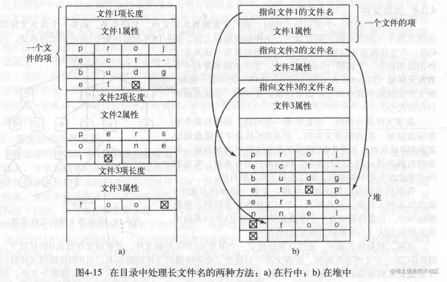 对于长文件名,有两种实现,两种方法区别看图,但是后者在删除添加文件时需要维护目录的堆,前者可能造成空间利用不充分,和连续分配的缺点一样,后面加入的文件名可能找不到合适的大小。