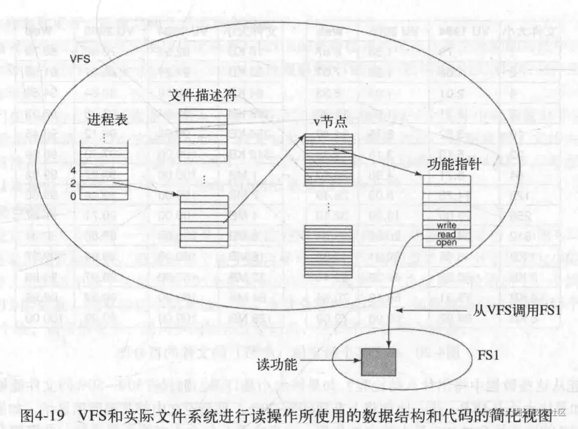 当调用者使用文件描述符进行操作时,VFS通过进程表和文件描述符表来确定v节点的位置,并跟随指针指向函数表(这个函数表包含了一些可以用来操作实际文件系统的函数调用),然后由实际的文件系统来完成相应的操作,此时一个处理完成。