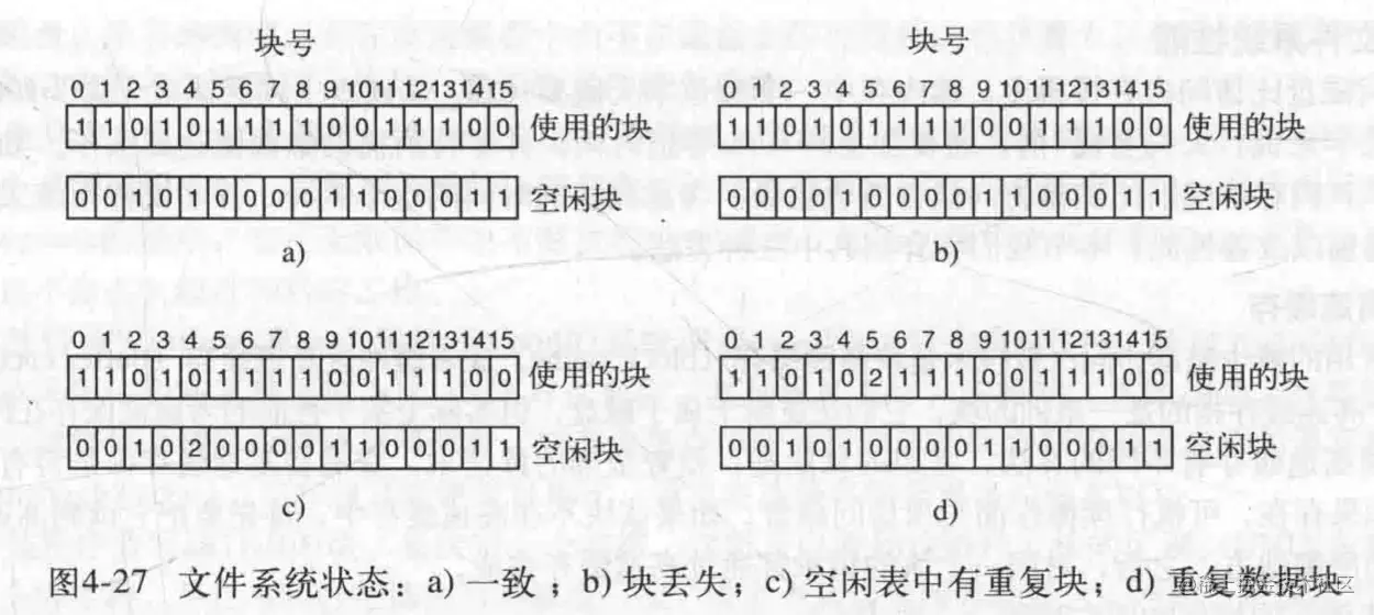 程序构造两张表,一记录每个块在文件中出现的次数,另一个记录块在空闲区中出现的次数,空闲块计数直接读取空闲列表就能做到,已使用计数,则需要读取全部i节点,然后把i节点包含的数据块在已使用表里面+1;所以有可能出现四种情况: