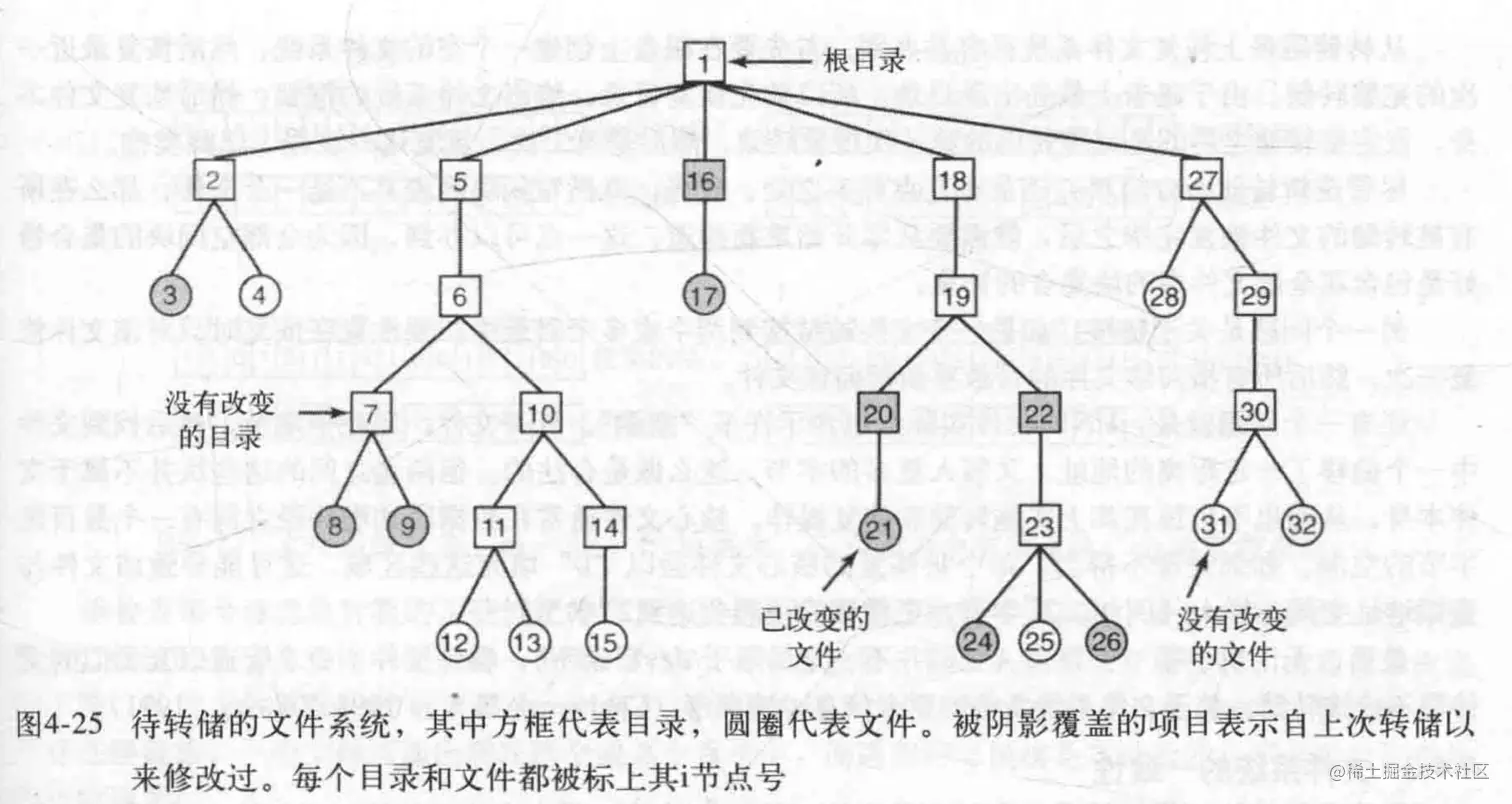 逻辑转储算法要维持一个以i节点为索引的位图,每个i节点包含了几位,随着算法的执行,位图中的标志位会被设置或清楚。算法的执行分为四个过程。