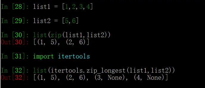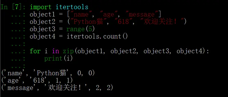 它的参数并不要求是同一类的可迭代对象,因此可以有非常多的组合方式,例如: