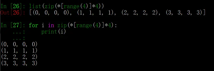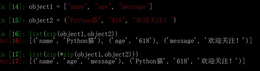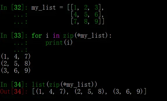 解包操作符对于 zip 对象同样适用,因为 zip() 本身是一次行列转换的操作,若将它解包后作为参数给 zip(),等于再做一次行列转换,也就是回到了原点(除了最后的结果是元组):
