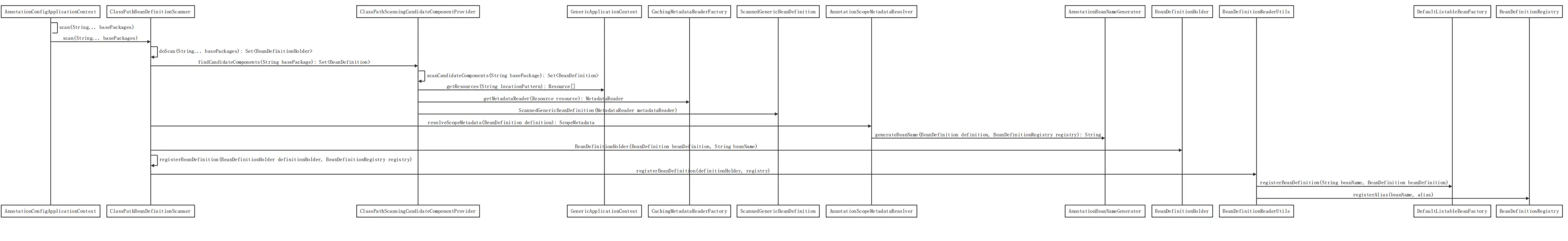 关于扫描包加载注解类的步骤为,首先根据定义路径递归遍历其下所有文件将其解析为 Resource 数组。然后遍历 Resource 数组根据其信息创建 ScannedGenericBeanDefinition 这样一个待完善的 BeanDefinition 集合。然后遍历这个集合解析出 Scope、创建 BeanName 解析出别名等信息据此创建出 BeanDefinition。最后将 BeanDefinition 放入容器中同时保存好它的对应别名信息