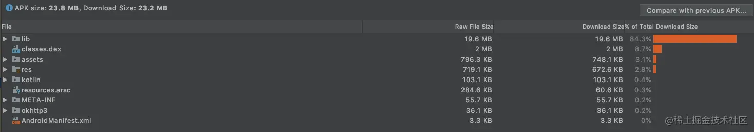 看看 app-armeabi-v7a-release.apk 包大小,结果是不是贼喜人?由 23.8 MB 直接减少到 9.8 MB。