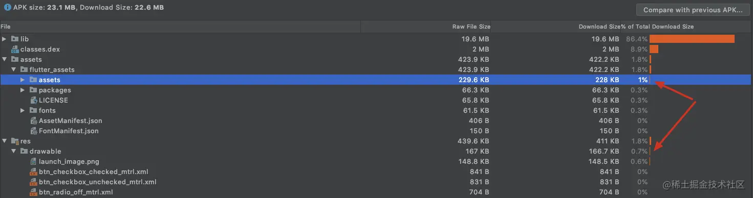 针对 Flutter 打出的 Apk 包,排在第一位的便是 lib,占比 86.4%,足足有 19.6 MB: