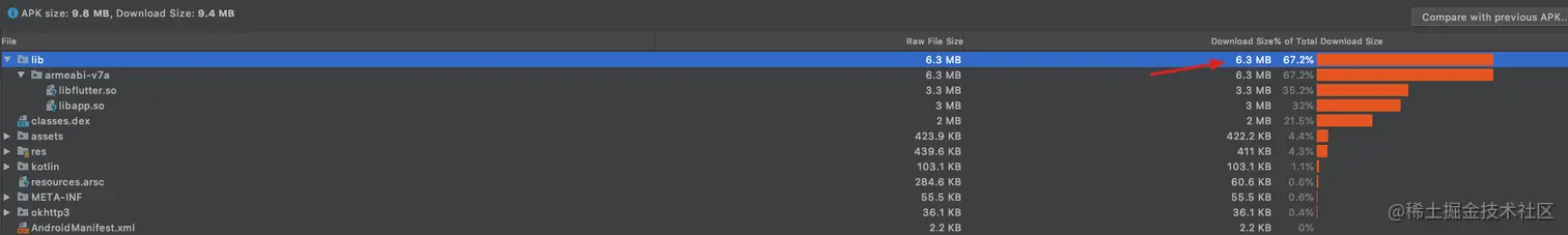lib 占比也从原来的 86.4%,19.6 MB 直接减少为 67.2%,大小 6.3 MB。