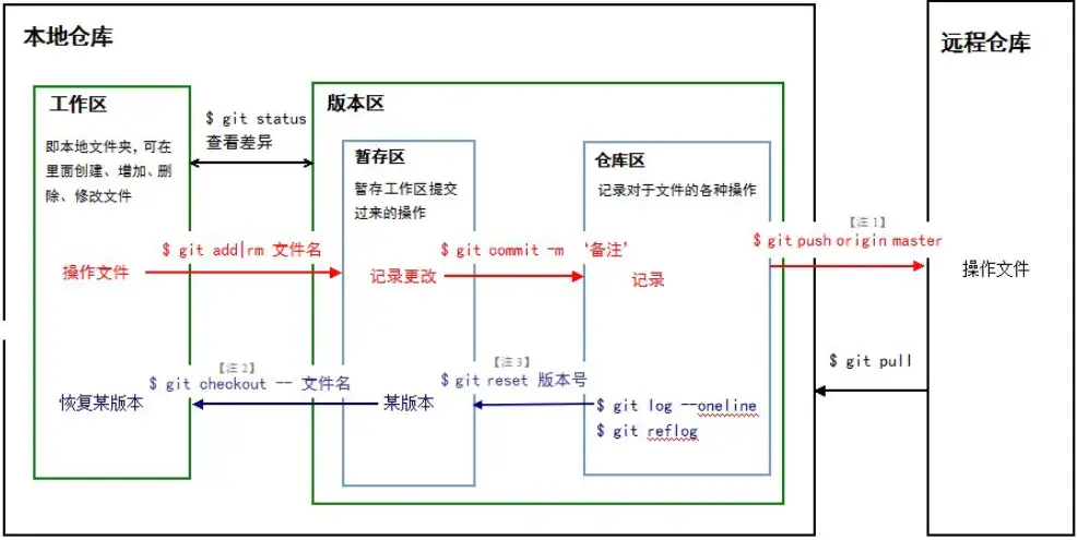 git commit -m [注释] commit提交,提交暂存区文件到仓库区