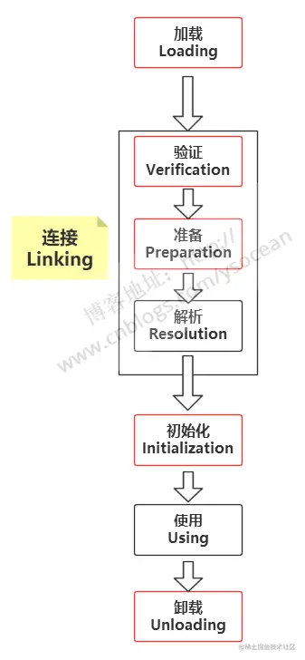 注意,加载阶段与连接阶段的部分内容(如一部分字节码文件的格式校验)是交叉进行的,加载阶段尚未完成,连接阶段可能已经开始了。