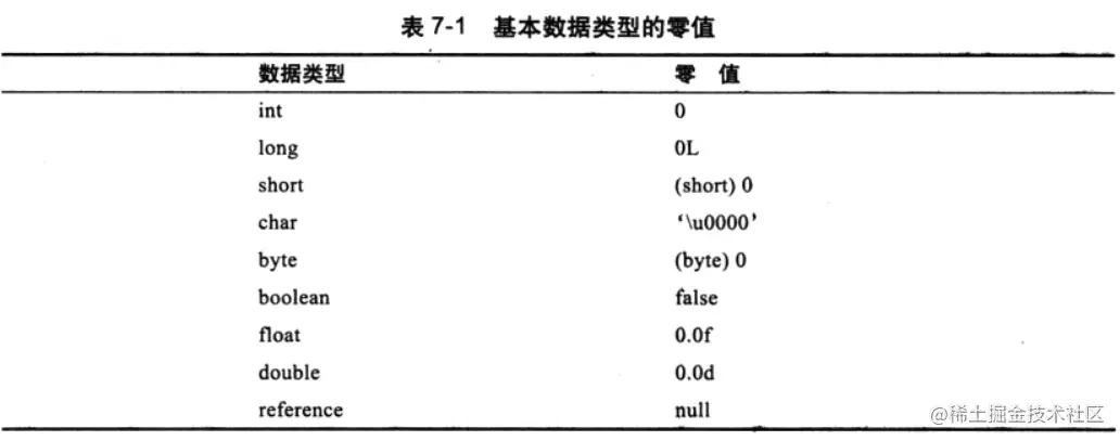 二、初始值,指的是一些数据类型的默认值。基本的数据类型初始值如下(引用类型的初始值为null):
