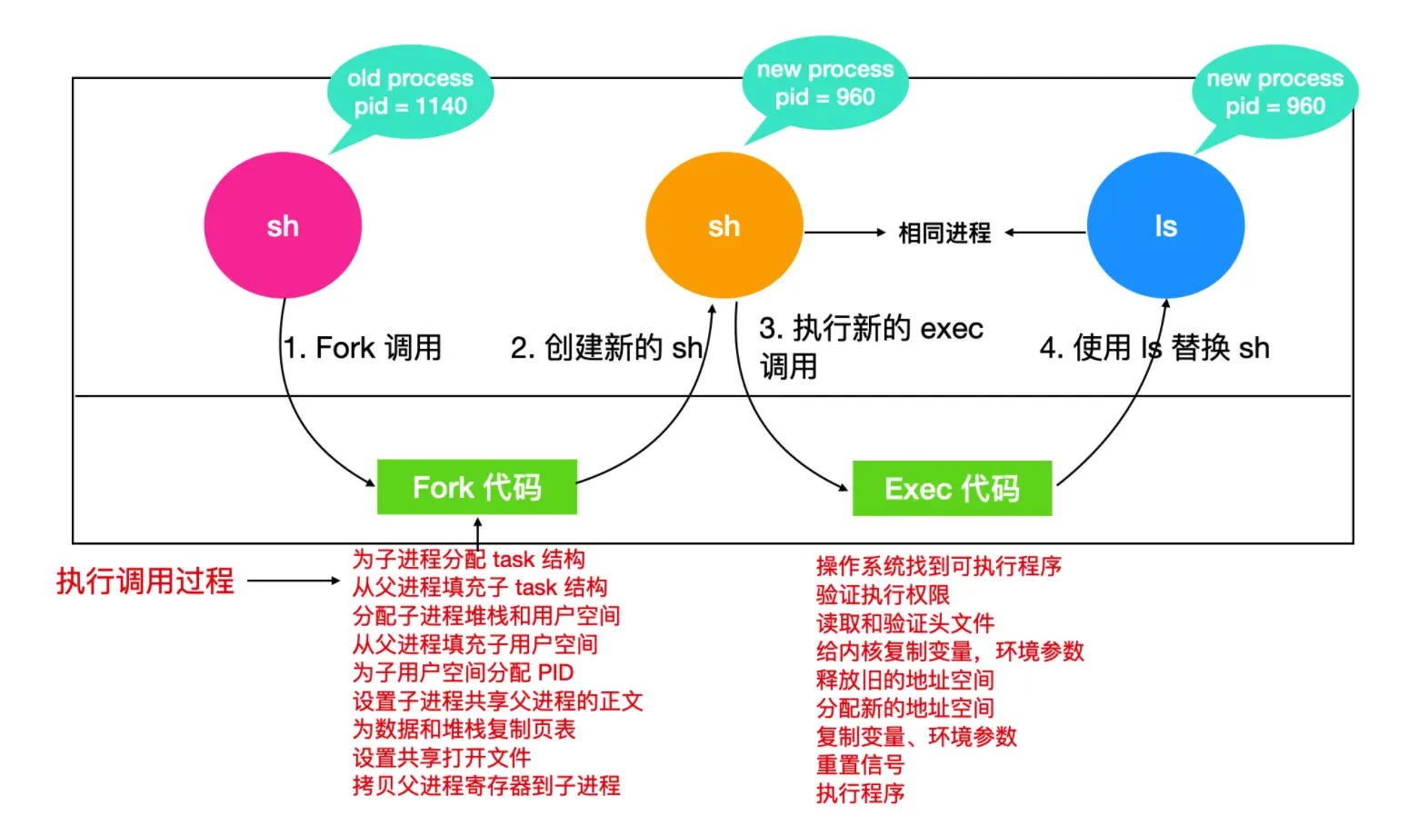 - 新的进程映像有 PID,相同的环境和一些文件描述符(因为未替换进程,只是替换了进程映像)