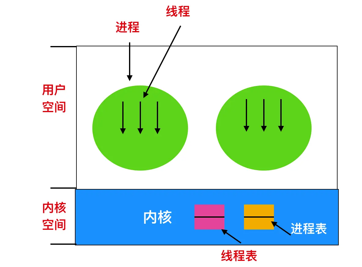 内核级线程通常使用几个进程表在内核中实现,每个任务都会对应一个进程表。在这种情况下,内核会在每个进程的时间片内调度每个线程。