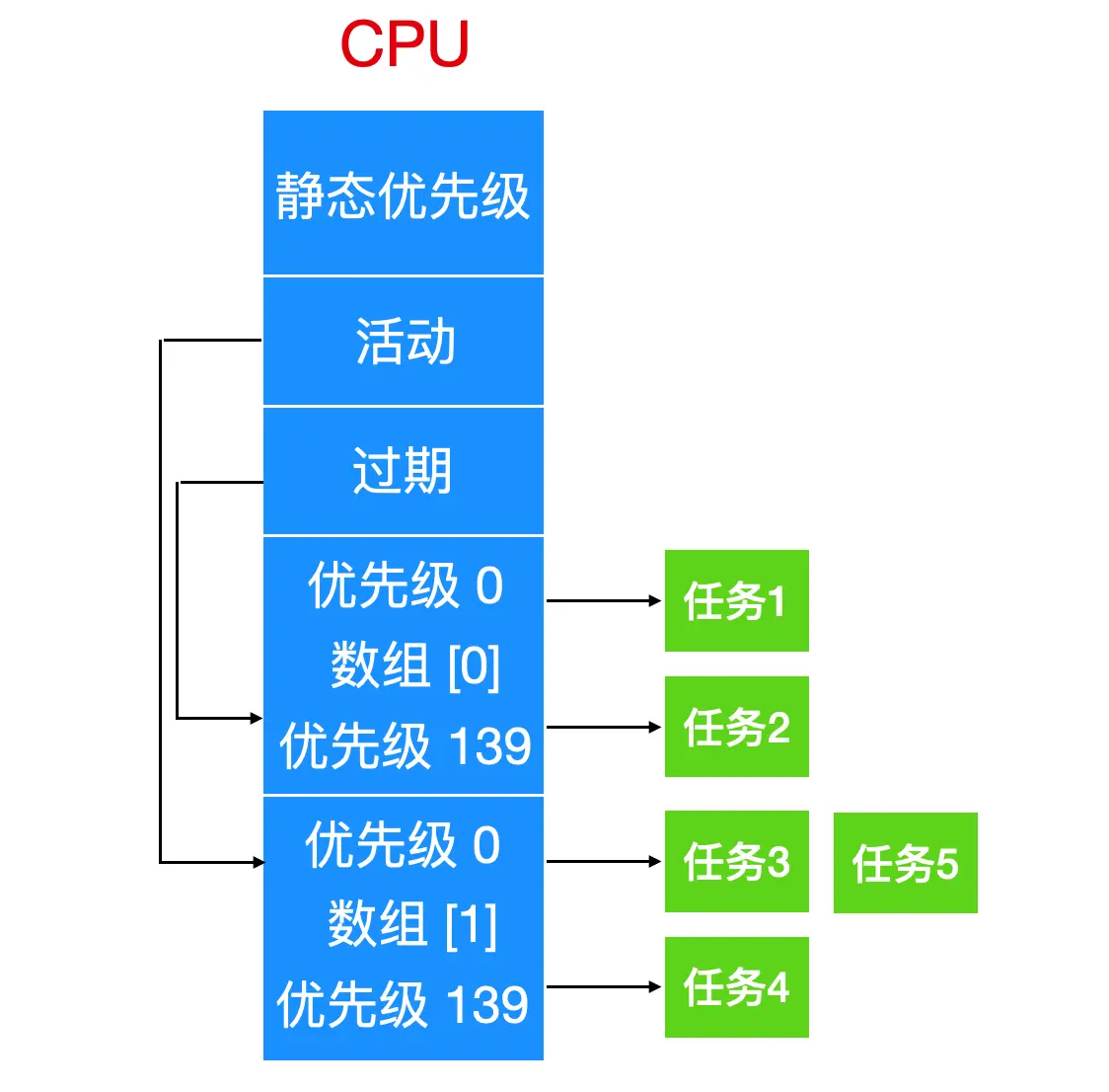 Linux O(1) 调度器是历史上很流行的一个调度器。这个名字的由来是因为它能够在常数时间内执行任务调度。在 O(1) 调度器里,调度队列被组织成两个数组,一个是任务正在活动的数组,一个是任务过期失效的数组。如下图所示,每个数组都包含了 140 个链表头,每个链表头具有不同的优先级。