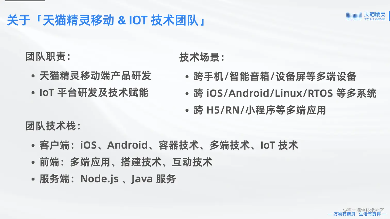 大家好,我来自天猫精灵,我们团队最近刚刚重组,目前有两方面的职责: