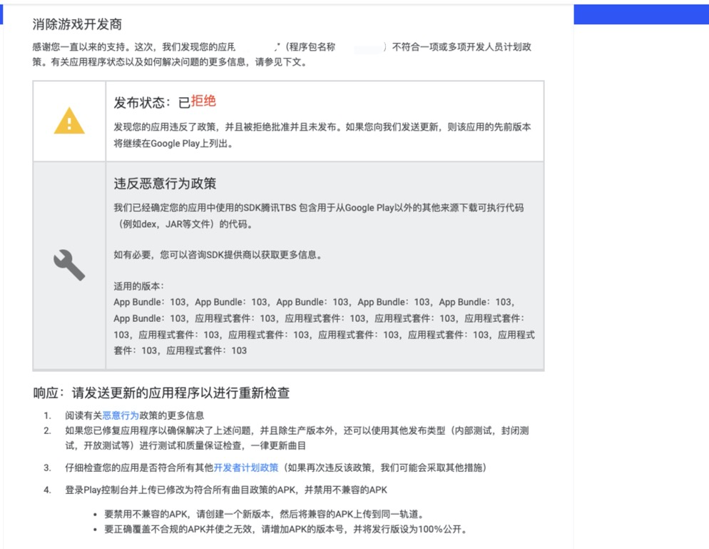 前两天EVA开发者交流群里一位朋友说收到Google Play邮件,APP上架被拒。原因是违反恶意行为政策,应用中使用的腾讯TBS SDK包含从 Google Play 以外的其他来源下载可执行代码(例如 dex、JAR 和 .so 文件)的代码。