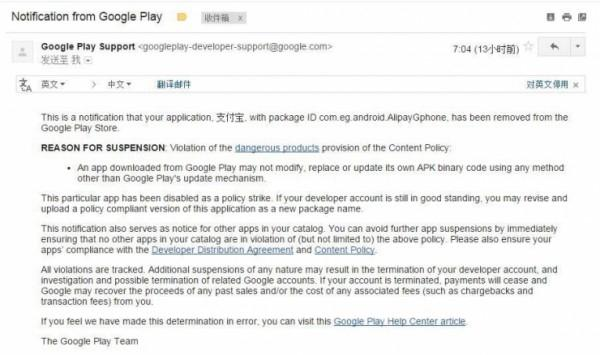 支付宝官方表示谷歌邮件通知的下架原因是支付宝APP的安卓版本带有升级功能。而按照谷歌最新修改的规则要求,上传到Google Play 市场的应用,不允许自身带升级功能,只能通过Google Play进行升级。