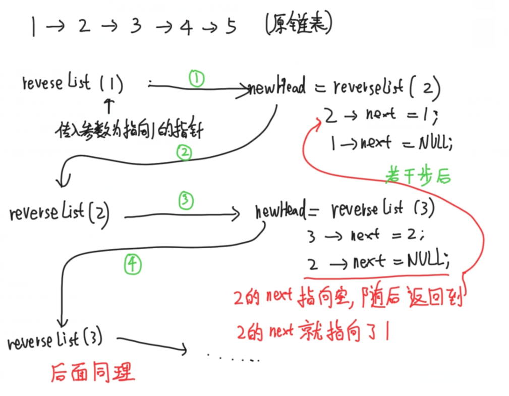 也就是新链表的头节点newHead, 这时需要先记录newHead的next指针指向head(翻转):head -> next -> next = head;