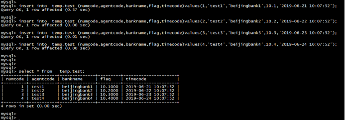 insert into temp.test (numcode,agentcode,bankname,flag,timecode)values(4,'test4','beijingbank4',10.4,'2019-06-24 10:07:52');