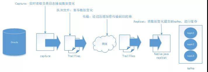 OGG(Oracle GoldenGate):基于日志的挖掘的技术,通过解析源数据库在线日志或归档日志获得数据的增量变化后,再将这些变化的数据传输到 Kafka 中,Kafka 将数据直接进行持久化之前进行消息队列的数据缓存。以下为数据采集架构图: