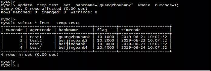 mysql> update temp.test set bankname="guangzhoubank" where numcode=1;