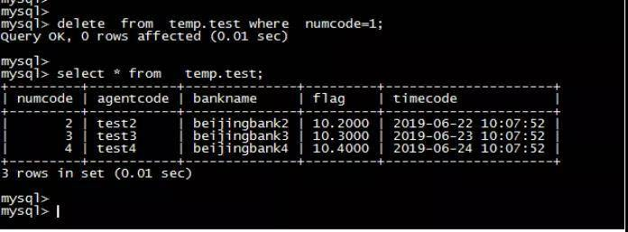 mysql> delete from temp.test where numcode=1;
