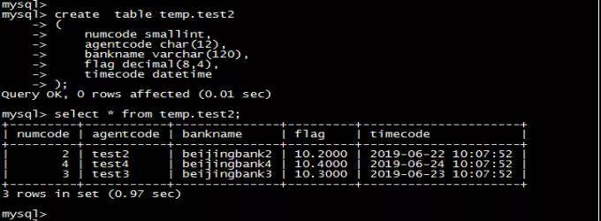 insert into temp.test (numcode,agentcode,bankname,flag,timecode)values(1,'test1','beijingbank1',10.1,'2019-06-21 10:07:52’);