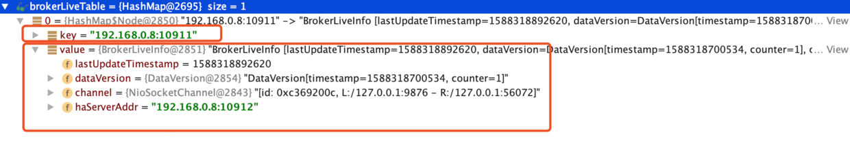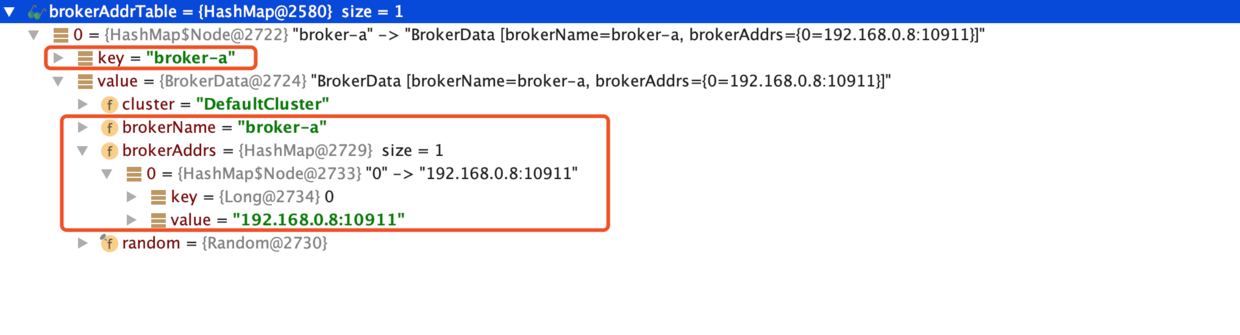 - brokerAddrTable保存以brokerName为维度的broker实例信息BrokerData,BrokerData内部按照brokerId为维度的broker的地址。