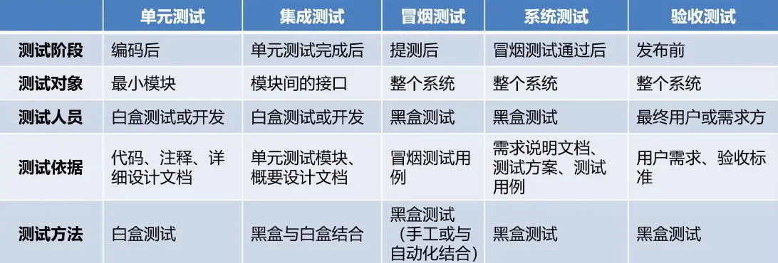 编程阶段:单元(白盒)测试,以开发为主,需要测试参与;关注覆盖率