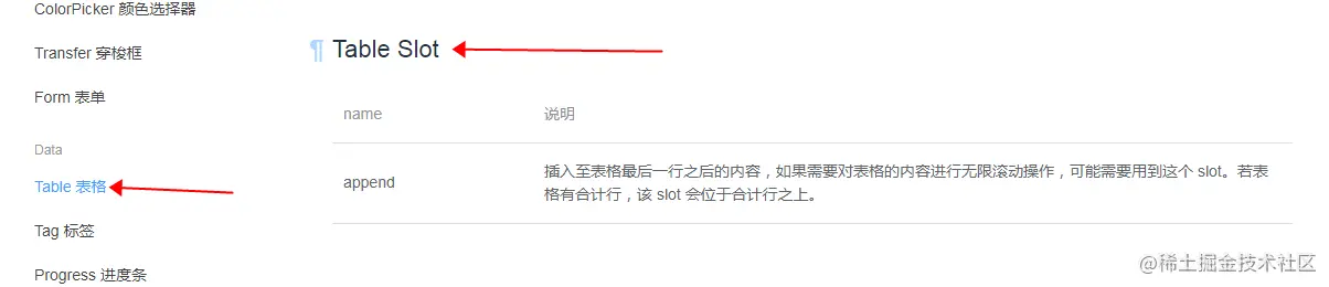 elementUI 中 <el-table>无限滚动的实现 已注销 2020-07-10 3,666 阅读1分钟 觉得也是时候 记录一些踩过的坑 近期做了一个需要在表格模块中实现的一个无限滚动 使用elementUI的朋友应该知道是有这样一个组件 —— 下图 官网的例子是基于 Ul列表来实现的无限滚动 在table实际应用当中,会出现我们的文字提示会跑到外面去,页面滚轮会一直停留在底部,直到全部加载完,也都不是我们想要达到的效果; 解决办法: 我们回到elementUI文档的组件,发现组件是有插槽的 使用: