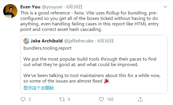 其实,刚开始了解到 tooling.report 来自于我非常喜欢的一位开源作者 Evan You(Vuejs 的作者)的推特: