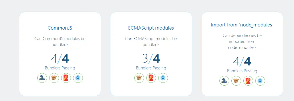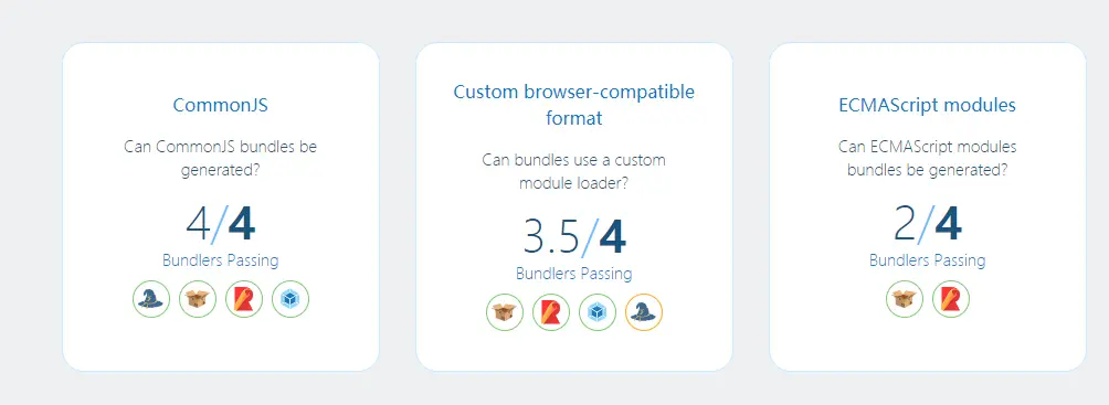 这里 importing modules 指的是是否支持各种不同的模块语法。很明显的是,各大构建工具对该特性的支持都不错。这里我们就不像 code split 一样一个个分析了(不然文章太长,写的也很累):