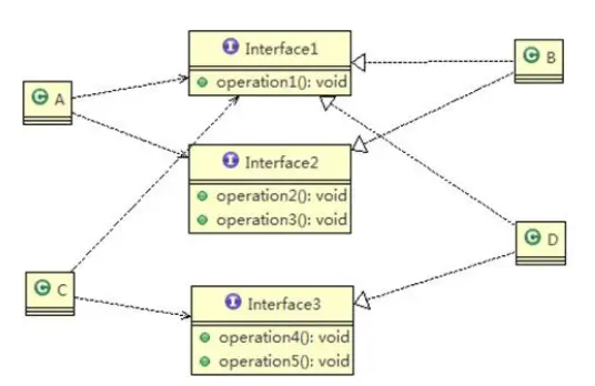 按隔离原则应当这样处理: 将接口Interface1拆分为独立的几个接口(这里我们拆分成 3 个接口),类A和类C分别与他们需要的接口建立依赖关系。也就是采用接口隔离原则