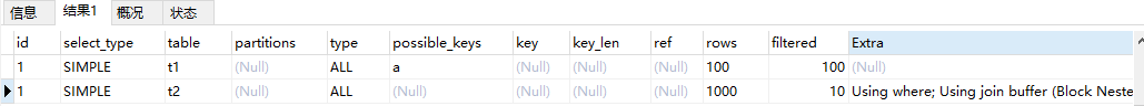 - 扫描t2,把t2中的数据取出来和join buffer中的比较,整合结果集