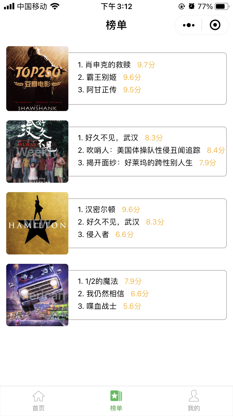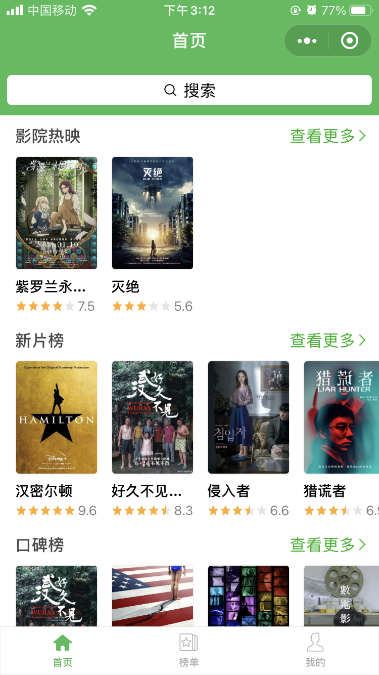 微信小程序 仿写豆瓣评分 薛定谔的猫box 2020-07-10 580 阅读1分钟 这是在跟随某大佬学习时,练习的项目,仅供参考源码地址:https://github.com/wangliqiang/douban-mp.git以下是截图,就不贴代码了,都在github上了,需要自取!!!首页榜单我的电影详情查看全部