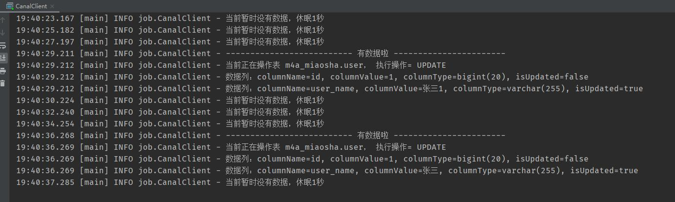 Canal成功收到了两条更新操作: