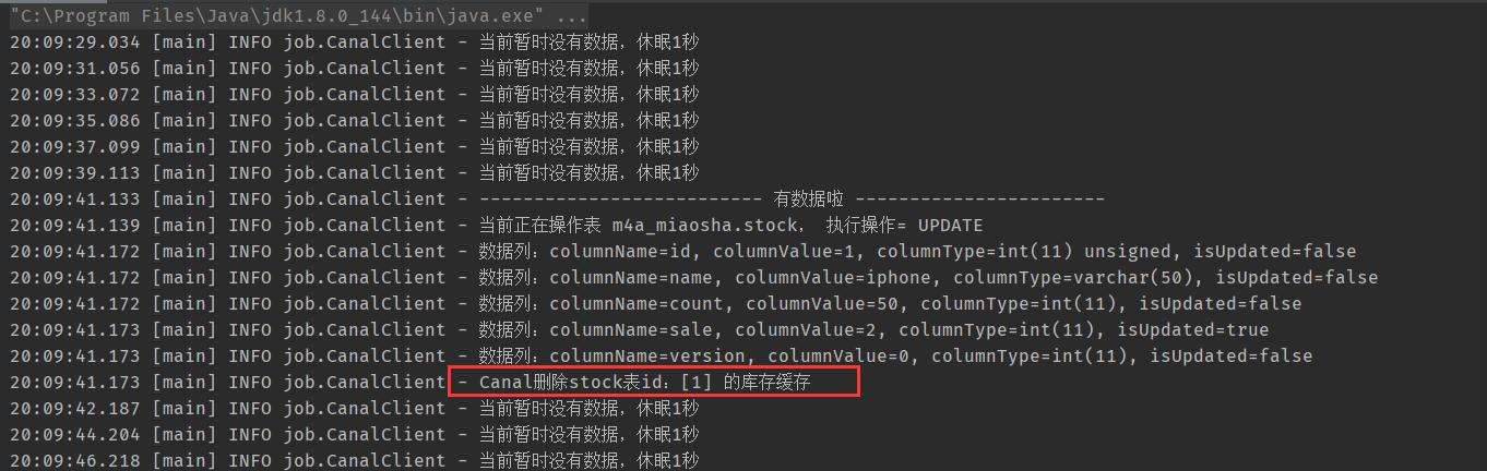 }「在上面的代码中,在收到m4a_miaosha.stock表的更新操作后,我们刷新库存缓存。效果如下:」