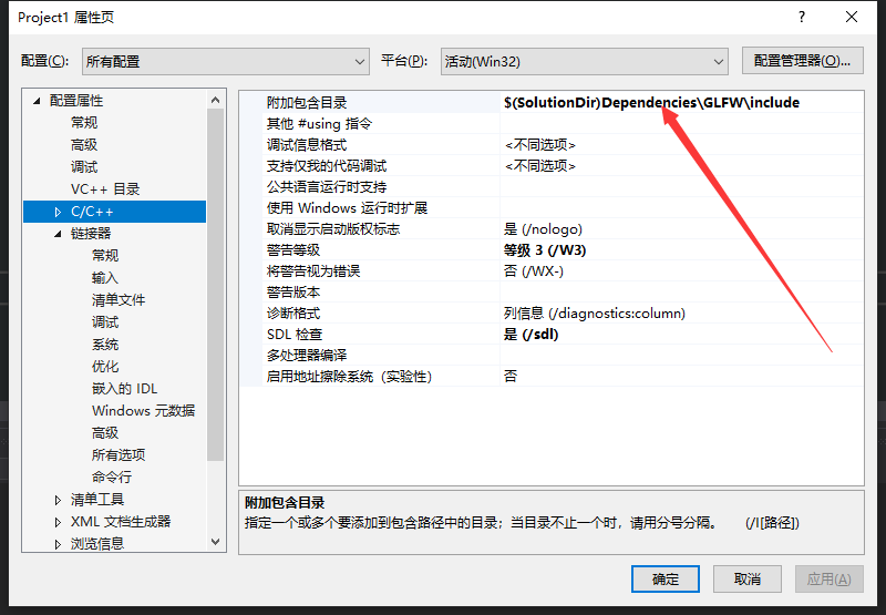 6. visual studio内右键工程,打开属性面板,修改c/c++的附加包含目录为$(SolutionDir)Dependencies\GLFW\include