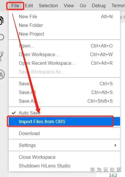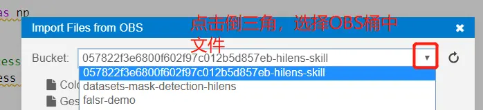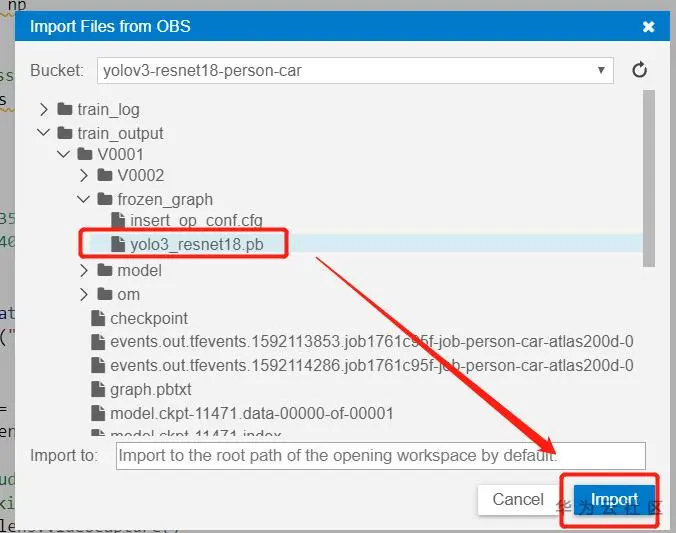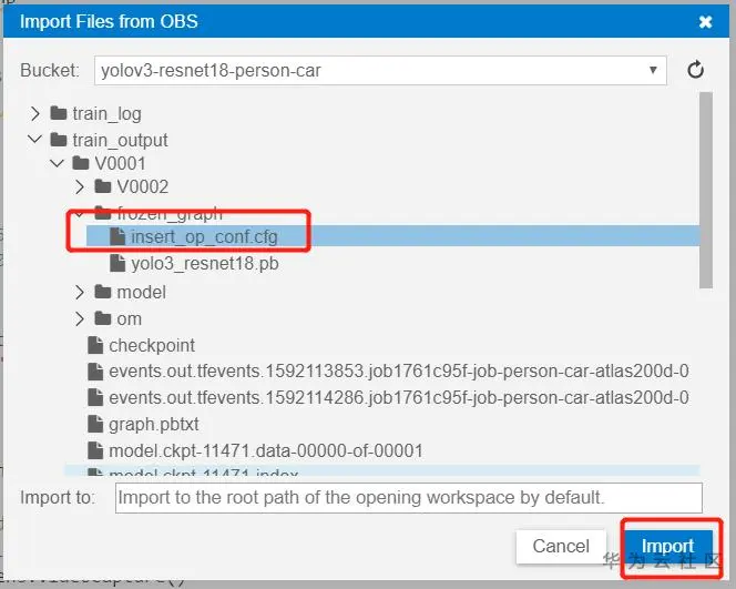 这里可以将模型训练输出到OBS桶的模型直接导入到HiLens Studio中,完成模型转换,非常方便,这真是极致的云端操作,将云服务发挥到了极致啊。当然,你也可以自己从本地电脑上传到HiLens Studio中哦。来看看怎么导入吧,很简单,选择Import Files from OBS,之后找到自己的模型存储再OBS的路径就行了,注意这里目前一次只能导入一个文件,所以需要两次操作,一次是导入.pb模型,一次是导入转换的配置文件,暂不能导入文件夹哦。