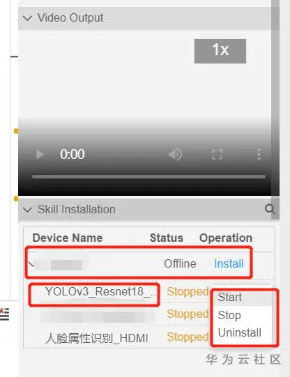如果你想安装到HiLens Kit上,和原先的操作台类似,在上面视频播放界面下面就有选线的,大体如下,仍然是先安装,后启动就行了: