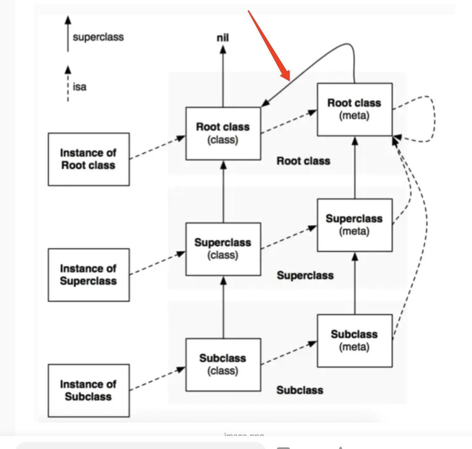 注意以下类和元类的关系中的红色箭头,可以看出元类的基类的superclass指针最终指向的是类的基类。所以这句循环最后的一步判断结果就是