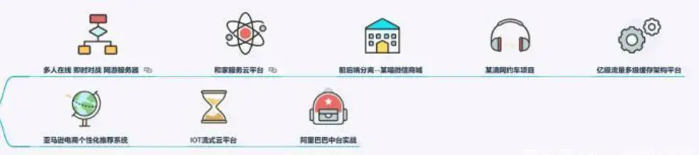 比如再造淘宝项目落地实战,某滴网约车项目,多人在线即时对战网游服务器,和家云服务平台,前后端分离某喵微信商城,亿级流量多级缓存平台,亚马逊电商个性化推荐系统,IOT流云式平台,阿里巴巴中台实战,年初跳槽后去阿里面试6轮之后定级是P6。
