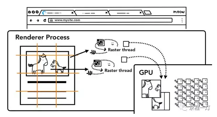 一旦创建了层树并确定了绘制顺序,主线程就会将该信息提交给合成器线程。 合成器线程然后栅格化每个图层。 一个图层可能像页面的整个长度一样大,因此合成器线程将它们划分为图块,并将每个图块发送给栅格线程。 栅格线程栅格化每一个图块并将它们存储在 GPU 内存中。