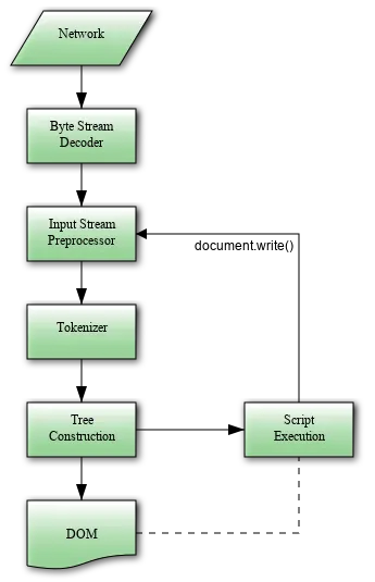 当HTML解析器找到 <script> 标记时,它会暂停解析 HTML 文档,并且必须加载、解析和执行 JavaScript 代码。 JavaScript 可以使用像 document.write() 那样改变整个 DOM 结构的东西来改变文档的形状,而 DOM 结构的改变会导致整个 render 树的重构或回流。