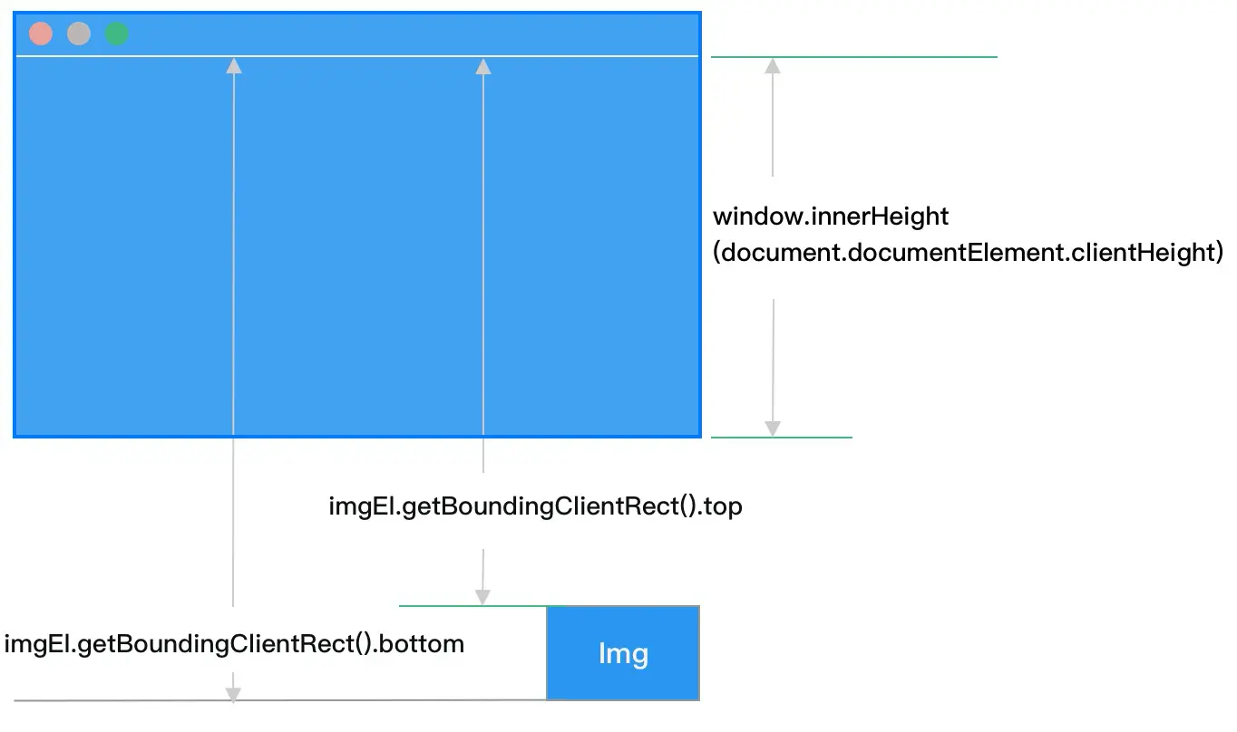 如图,当 imgEl.getBoundingClientRect().top <= window.innerHeight 时,元素进入视口,此时赋值图片的 src = data-src ,开始加载。