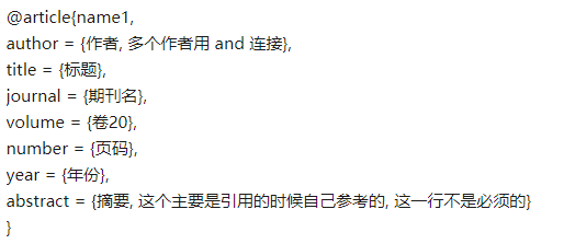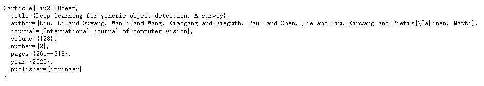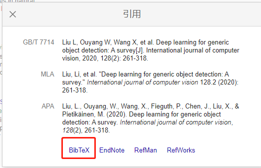 Google学术搜索参考文献->引用->BibTex,将内容拷贝至.bib文件。