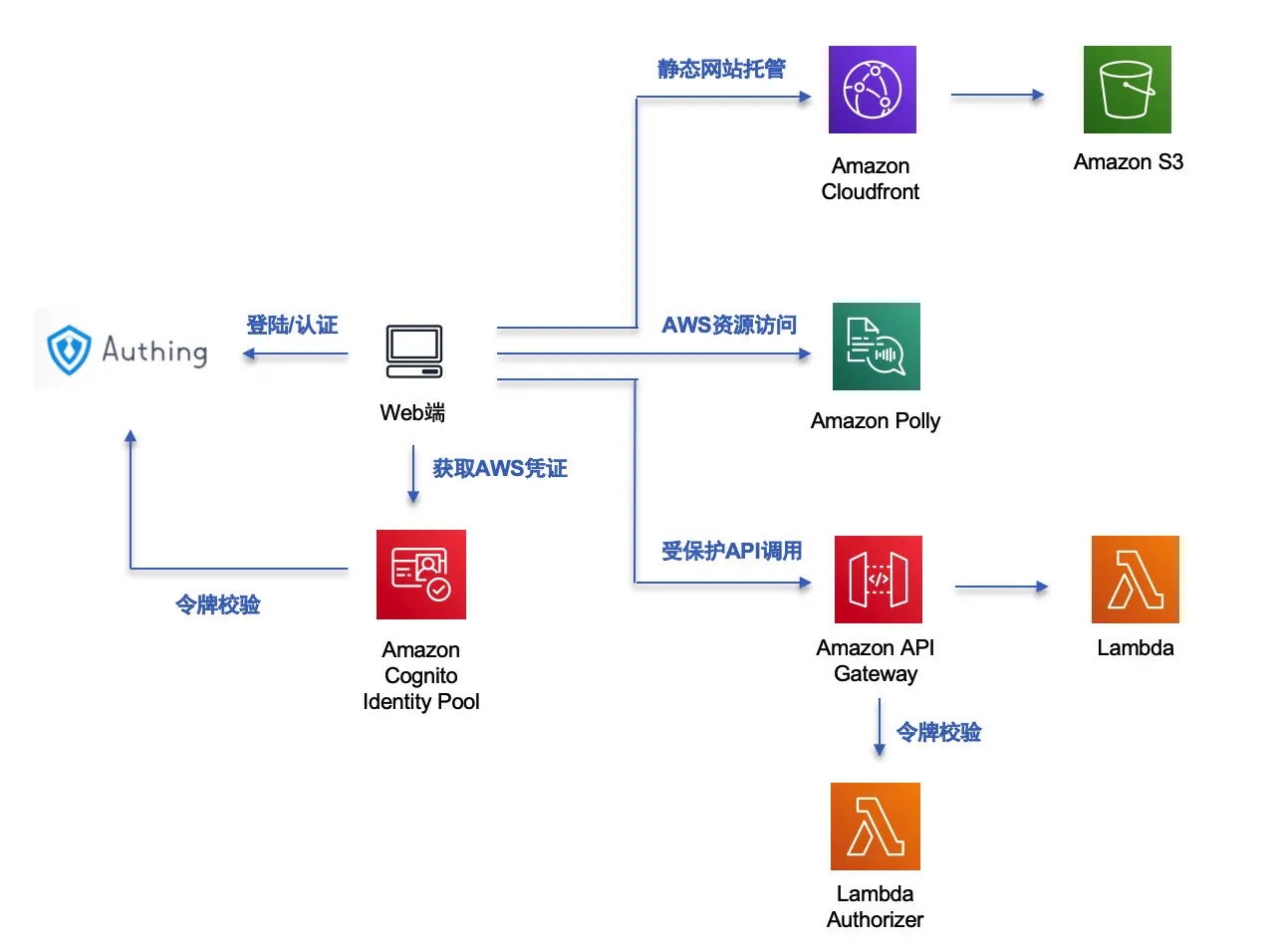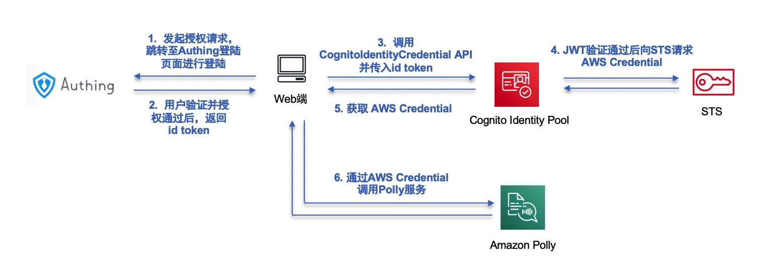 - 通过 Cognito Identity Pool 获取临时 AWS 凭证,访问 AWS 资源(这里以 Polly 服务为例)。