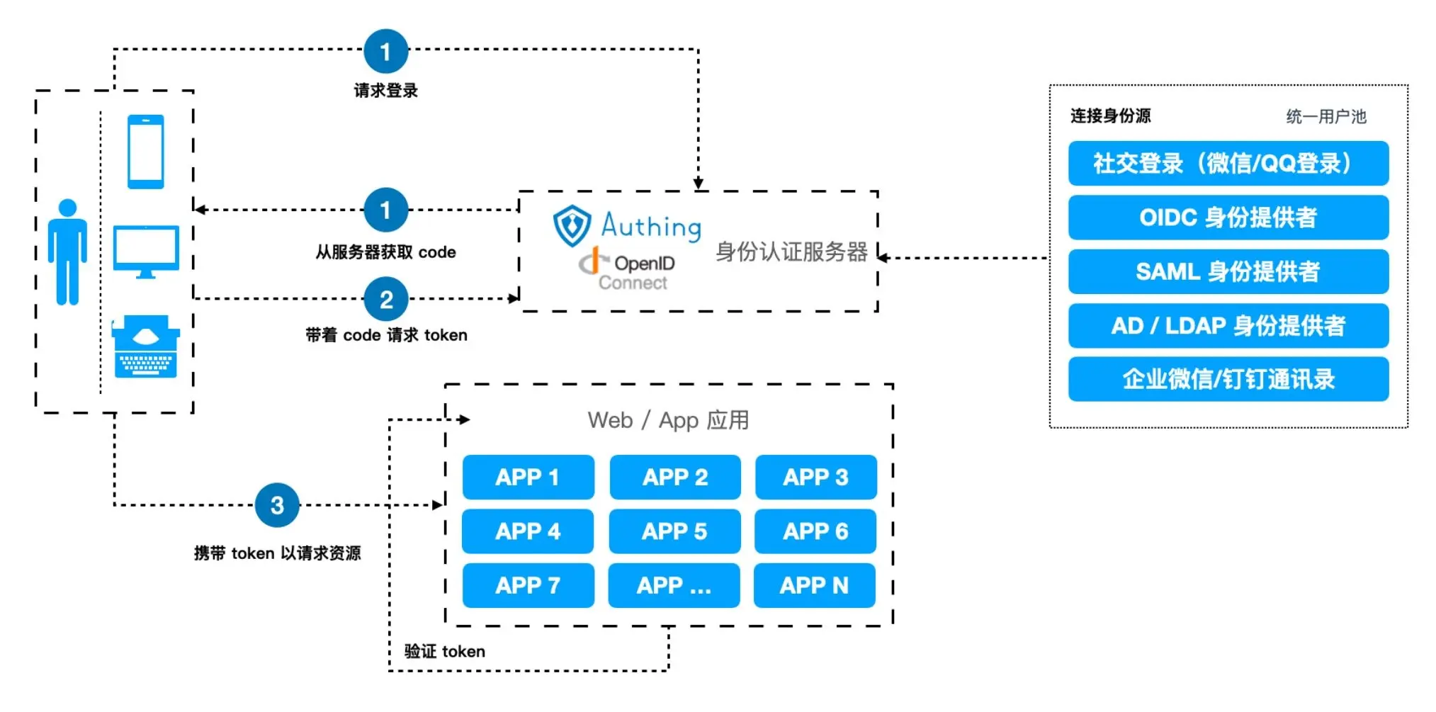 - 最后,用户可以使用 token 来请求访问各种应用资源。