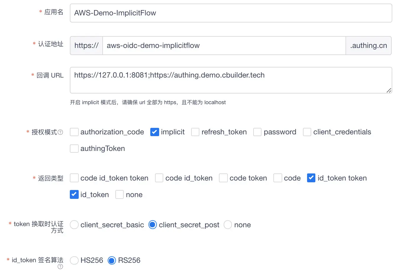 首先需要先在 Authing 中创建 OIDC 应用,具体可以参考Authing 相关的帮助文档。这个演示环境使用的是 Implicit Flow,并使用 RS256 算法进行 id token 签名,可参考如下进行回调 URL、授权模式、返回类型等设置: