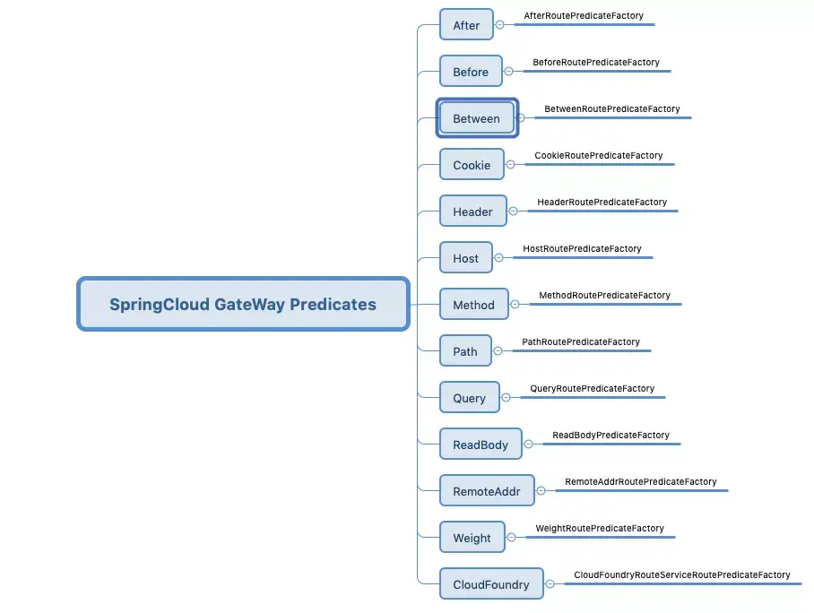在我们开始本章内容之前我们要来先了解下Spring Cloud Gateway内部提供的所有谓语、断言,这样我们才能目标性的进行学习,我整理出来了一个脑图,如下所示: